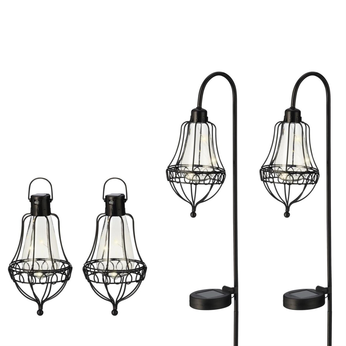 LED Solar Laternen und Gartenstecker - zwei Henkel u. zwei Erdspieße - D: 10cm - schwarz - 4er Set
