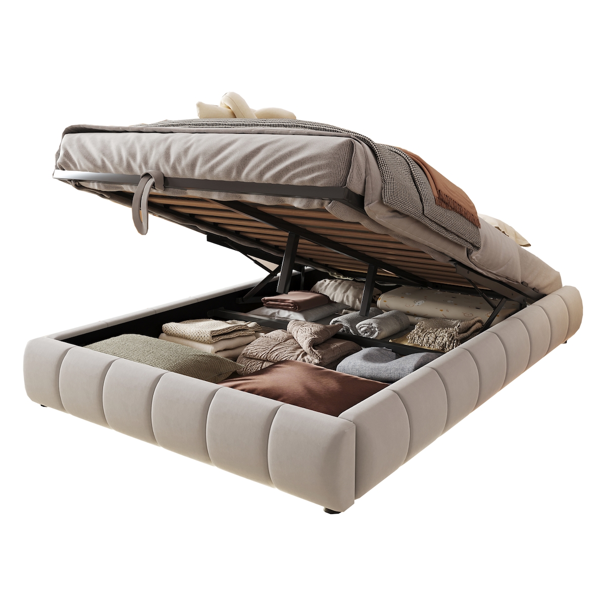 Polsterbett 140x200 mit hydraulischem Stauraum und LED-Lichtleiste – modernes, neutrales Design, komfortabel und praktisch Beige