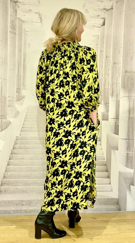 Langes leichtes Sommerkleid mit Blumenmuster in Gelb-Schwarz, Einheitsgröße