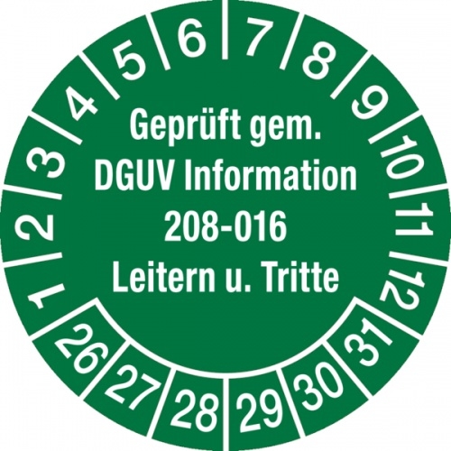 König Werbeanlagen Prüfplakette ab 26, DGUV Information 208-016 Leitern und Tritte, grün/weiß, Ø 30 mm - Bogen = 10 Plaketten - 30 mm Folie