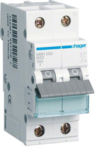 Hager MBN563 Leitungsschutzschalter 1P+N 6kA B-Charakteristik 63A 2 Module