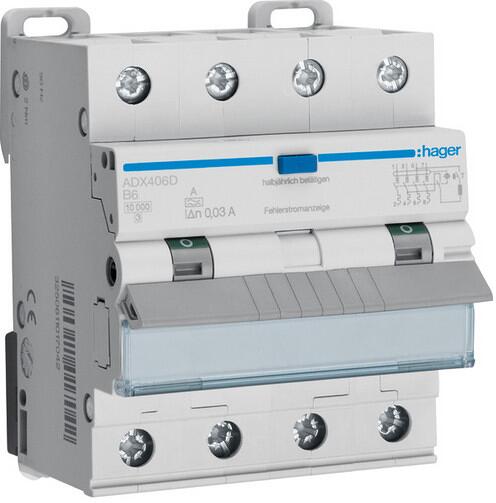Hager ADX406D Fehlerstrom-Leitungsschutzschalter 4P 10kA B-6A 30mA Typ A