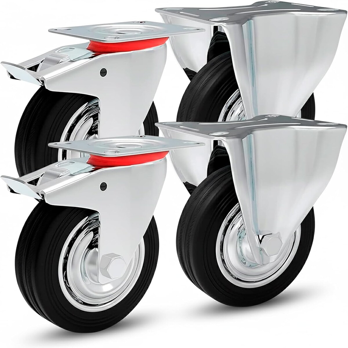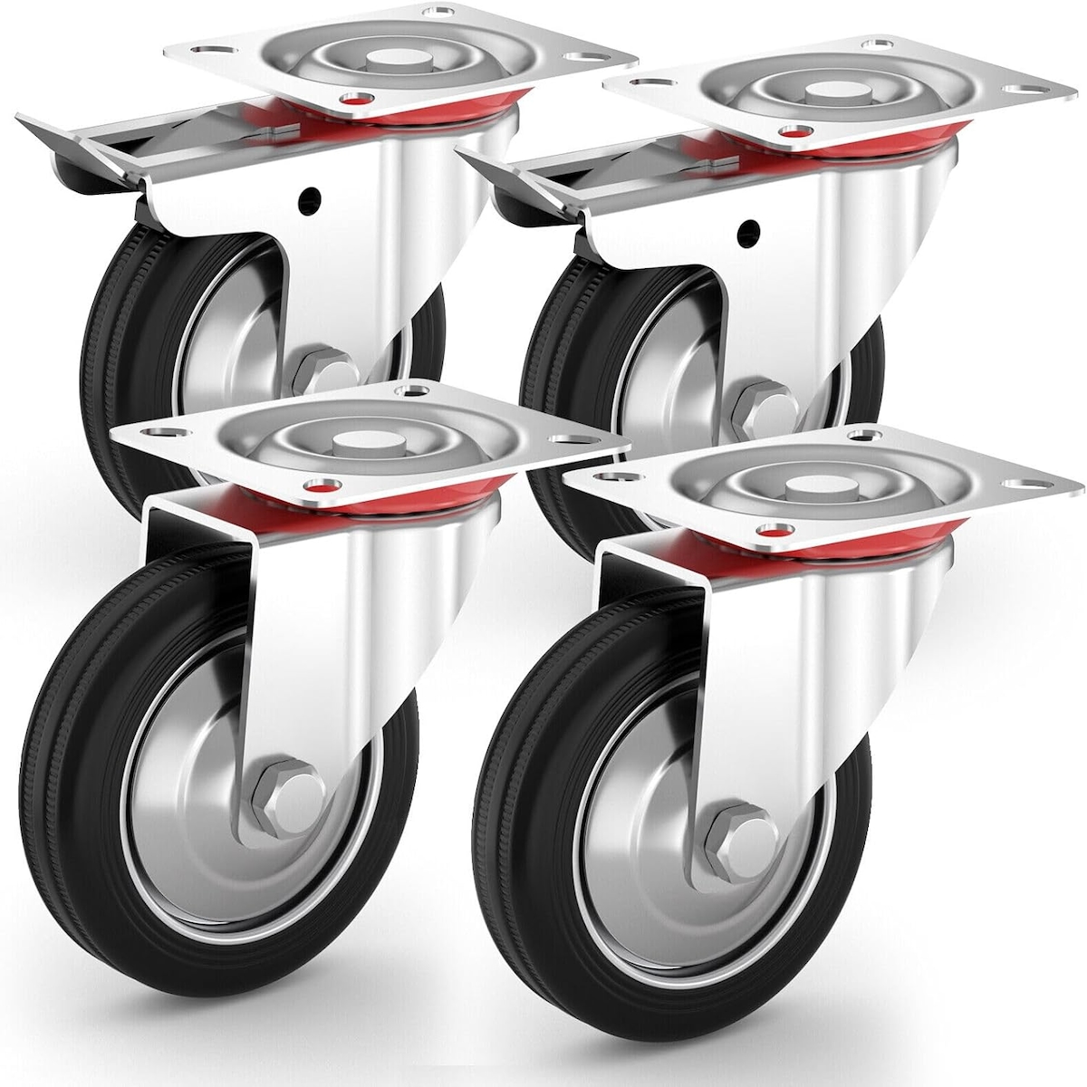 4 Stück 125mm Schwerlastrollen mit Bremse inkl. 2 Lenkrollen mit Feststeller, 2 Lenkrollen, 360° Drehbar Industrierollen Schwerlast, max.1200 kg