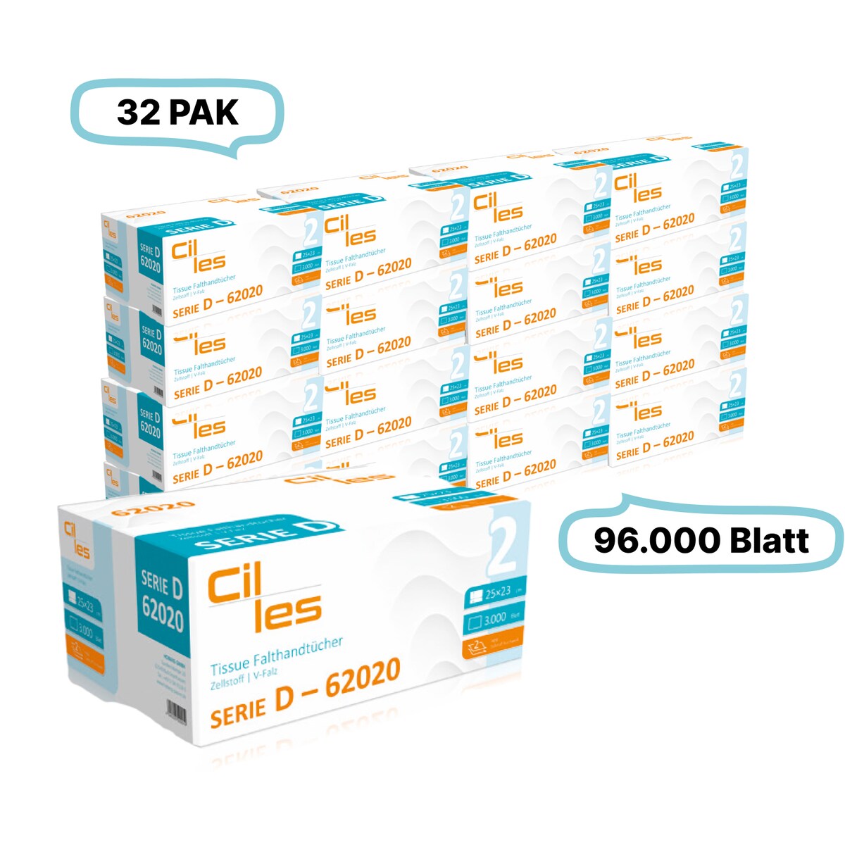 Falthandtücher 25x23cm, 2-lg, 32 Pak, 96.000 Blatt gesamt, 3.000 Blatt/ Pak, 100% Zellstoff, V-Falz, CIL- les Tissue, Series D