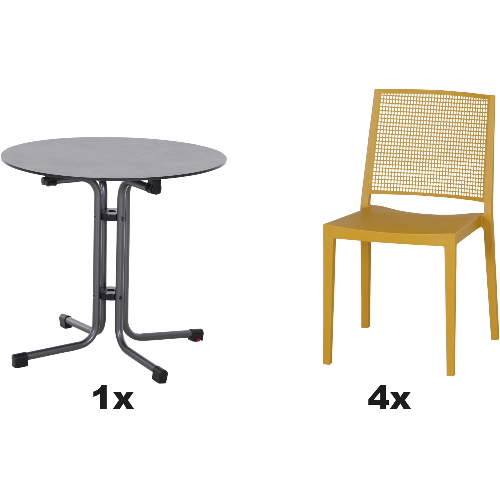 SIENA GARDEN Urban Lights Set 5teilig Square Stuhl gastrotauglich mustard mit Tisch Sola Ø80