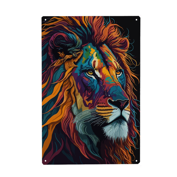 Metall Poster "Lion colorful" artboxONE - Natur,Tiere - Lion,Colorful,Art,Majestic,Wild,Mane,Fierce,Regal,Predator,Nature,Animal,Vibrant,King,Powerful