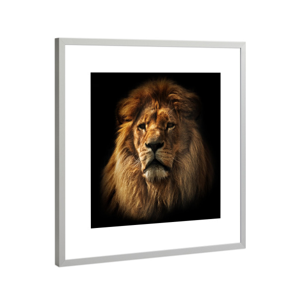 Poster mit Rahmen Silber "Lion portrait with rich mane on black" artboxONE - Reise / Afrika