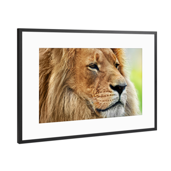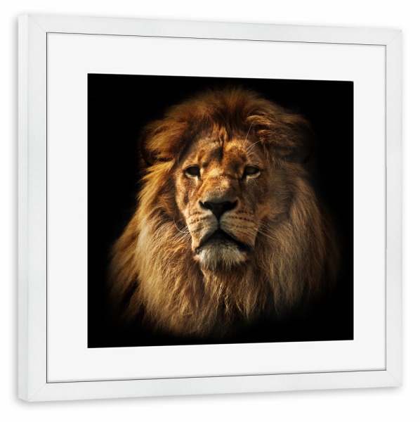 Poster mit Rahmen weiß "Lion portrait with rich mane on black" artboxONE - Reise / Afrika