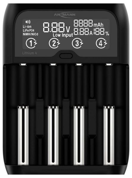 Ansmann Lithium 4 Universalladegerät mit 2x 18650 Akkuzellen (2600mAh) Ladegerät LiIon, LiFePO4, NiMH 18500, 18650, 14500, 16340