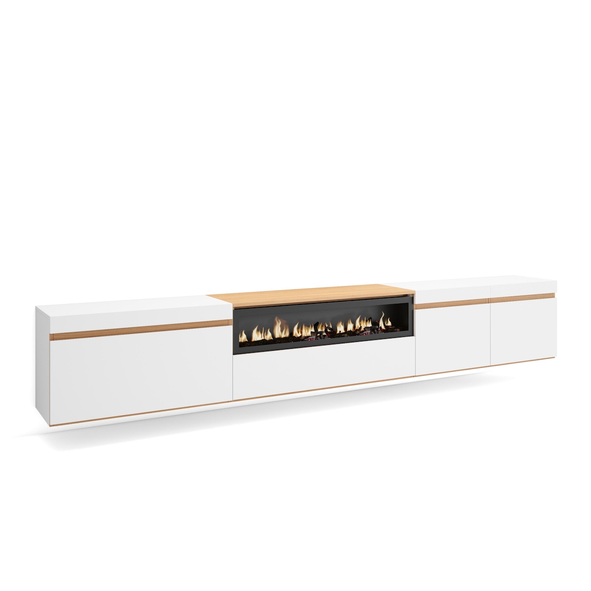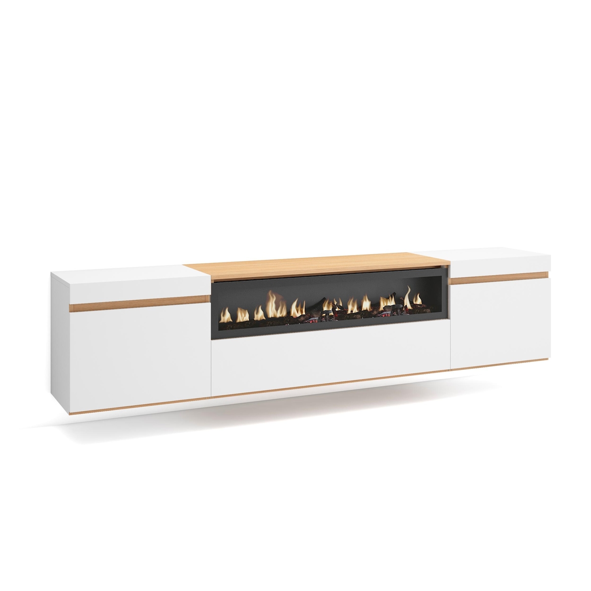 SKRAUT HOME TV-Schrank, Lowboard, 288x45x35 cm, Für großformatiges TV, Elektrokamin., Hängend, Weiß und Eiche Soft