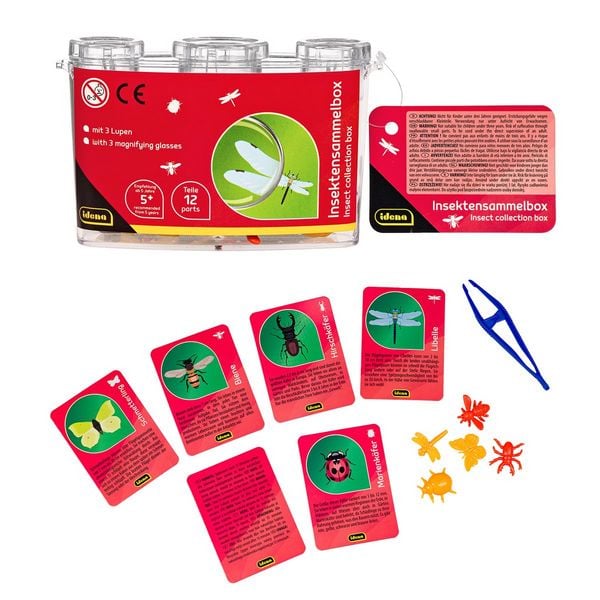 Idena - Insektensammelbox mit 3 Lupen, inkl. Pinzette und Insektenkarten, 5 kleine Plastikinsekten, Becherlupe für Kinder ab 5 Jahren
