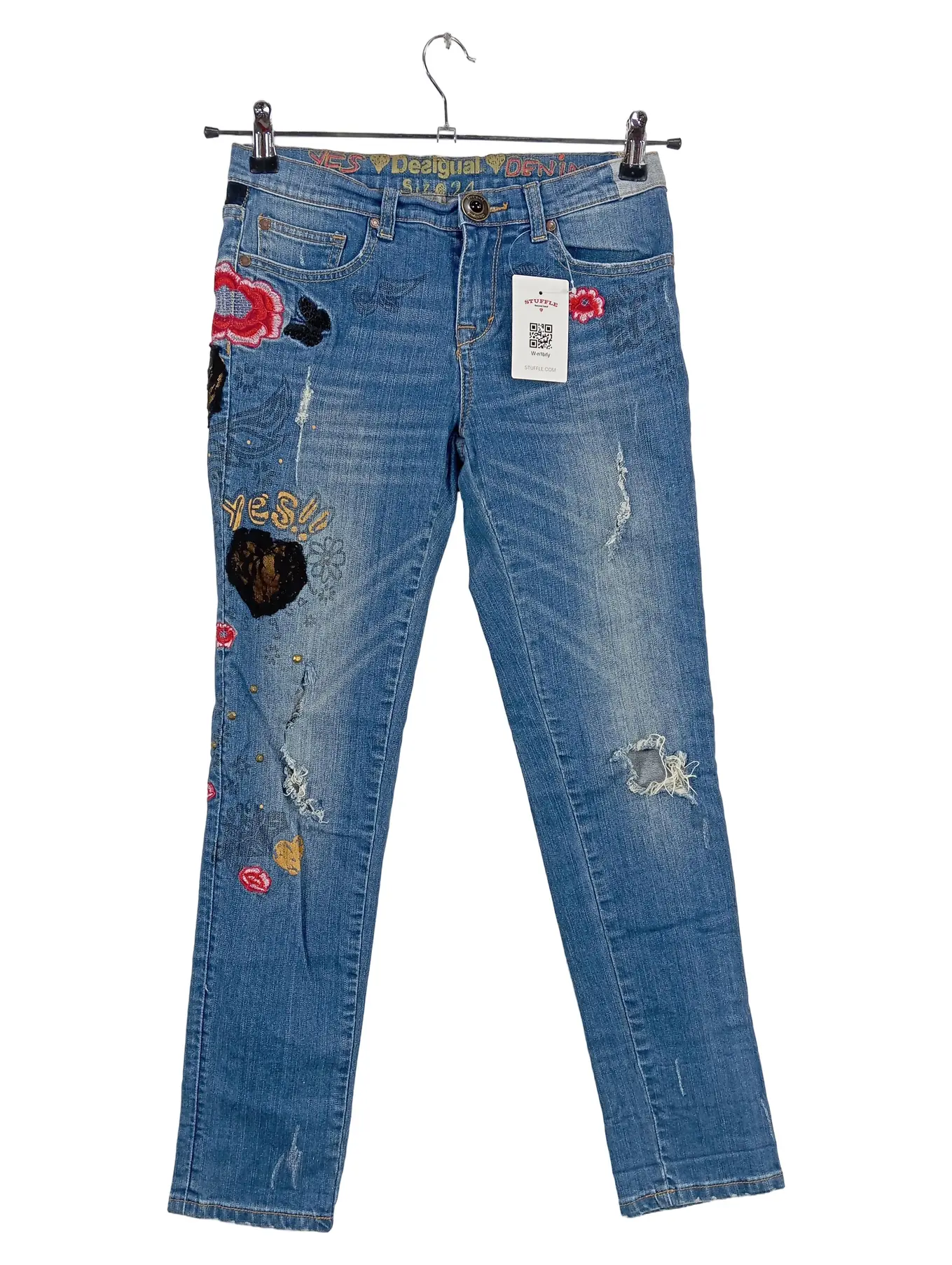 DESIGUAL Mädchen Jeans Slim Fit Gr. 128 Blumen Stickerei Blau