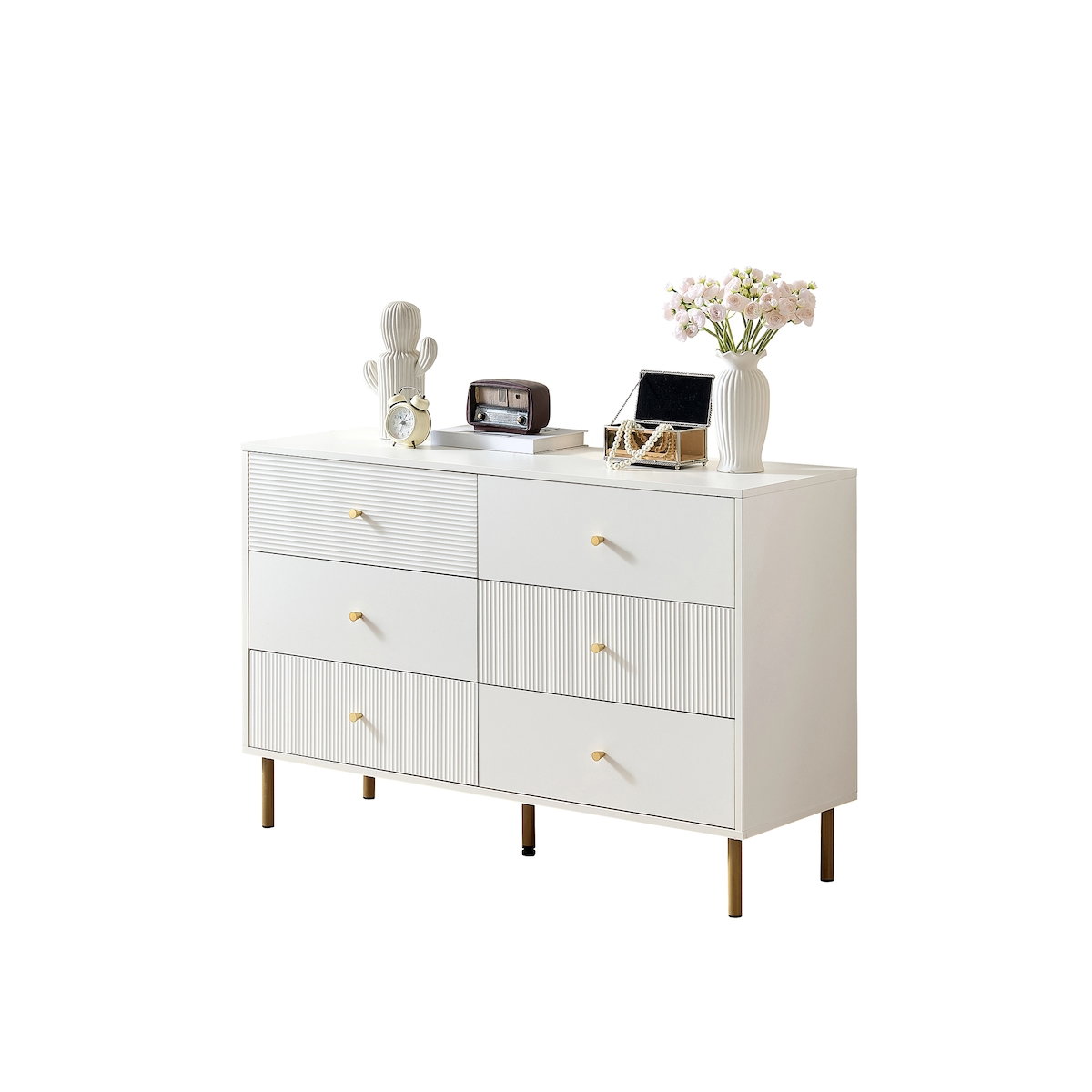 6-Schubladen-Kommode 120x40x78 Weiß mit Zinklegierung-Griffen und Stahlbeinen, modernes MDF-Möbel für Schlafzimmer und Wohnzimmer