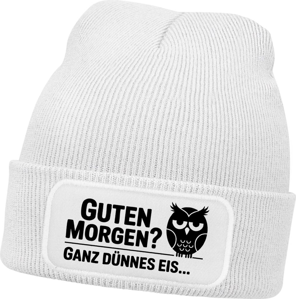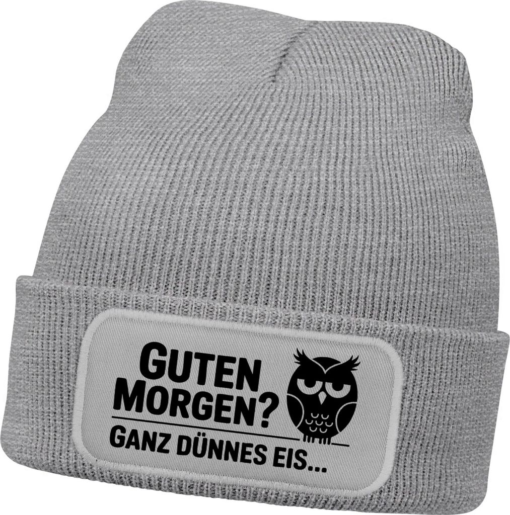 Herren Beanie Patch Grafik Print Eule Strickmütze mit Spruch Guten Morgen Aufdruck Lustig Mütze Männer Moonworks