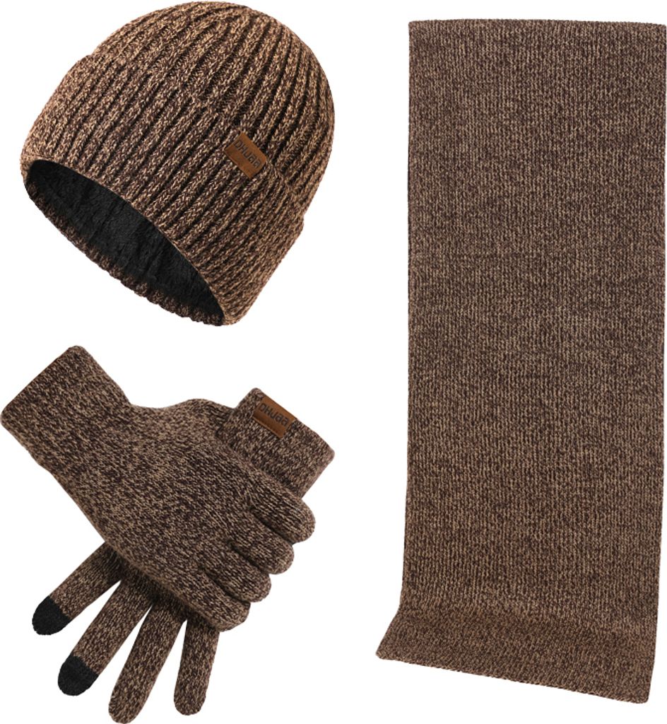 3-Teilige Winter-Mütze, wärmerer Schal, Touchscreen-Handschuhe für Männer&Frauen,Braun