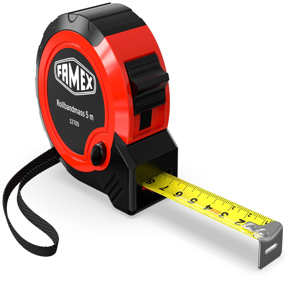 FAMEX 12706 Rollbandmaß mit Stopper, 5m, Maßband, Trageschlaufe, Gürtelklemme