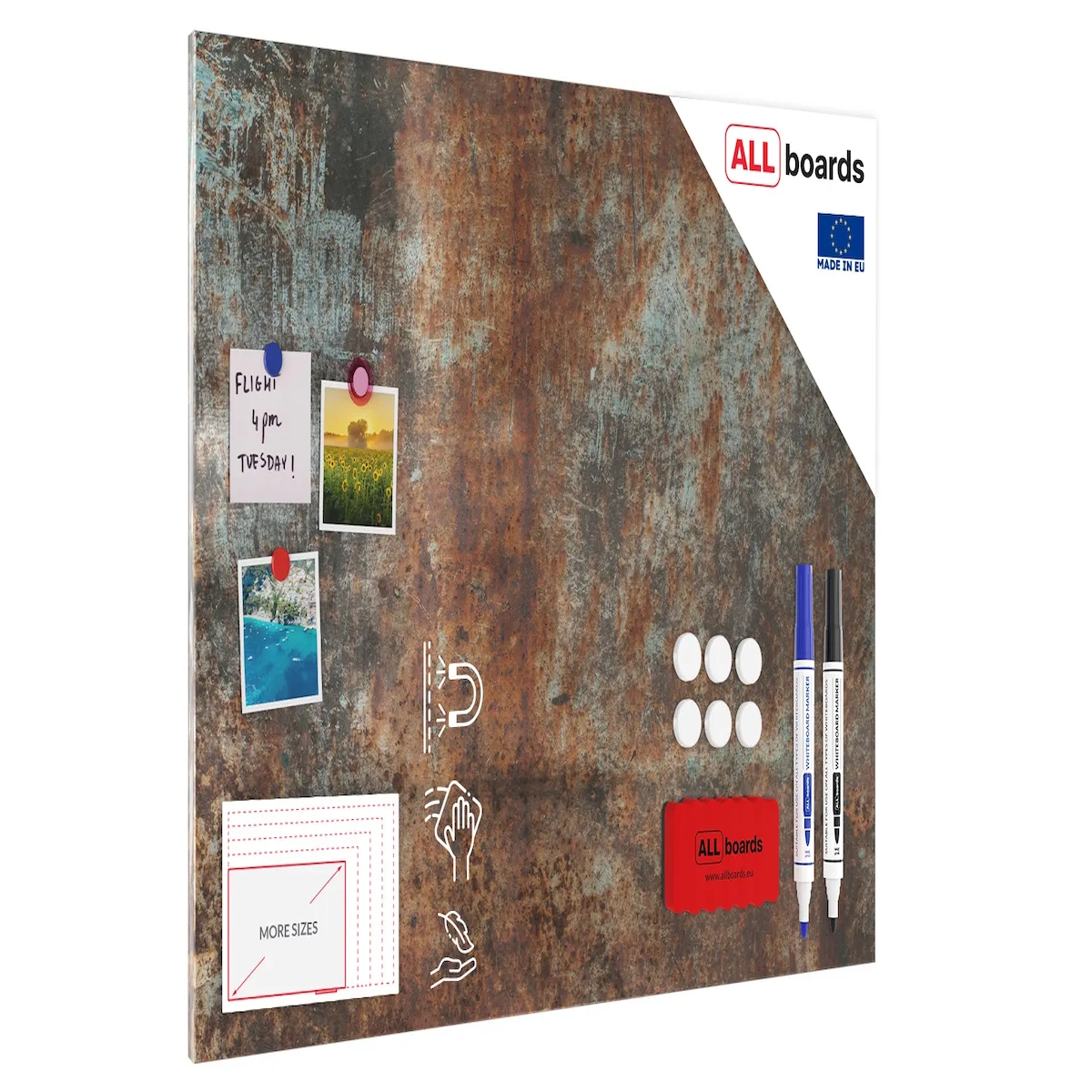 ALLboards Metallische Magnettafel ROST KORROSION 60x40cm Memoboard für jede Art von Magneten Magnetpinnwand + 4 Marker, 10 Magnete und Schwamm