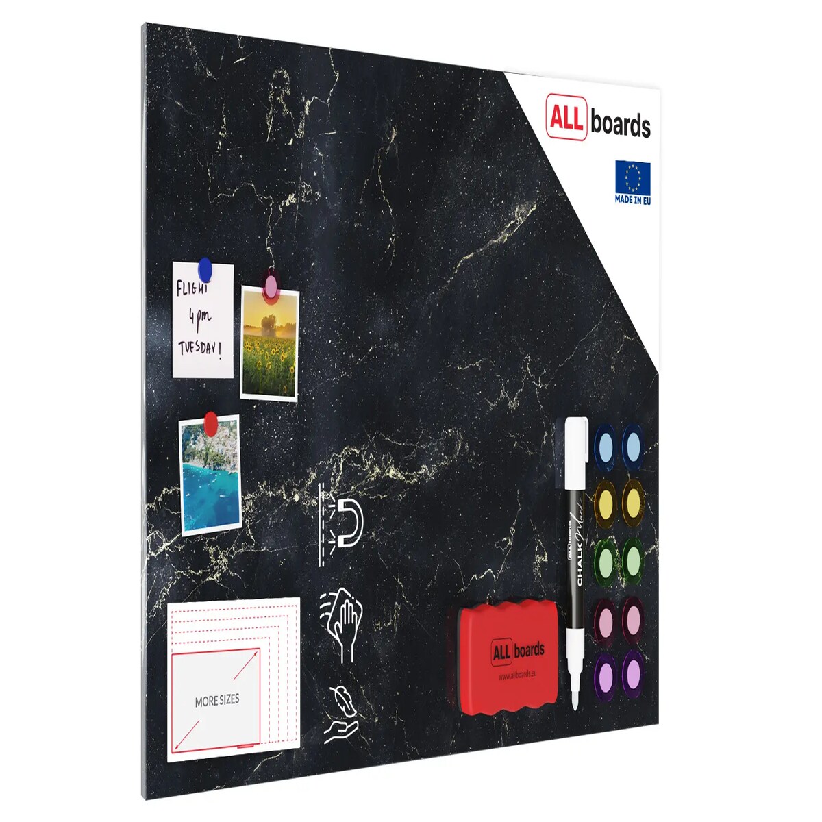 ALLboards Metallische Magnettafel SCHWARZER MARMOR 90x60cm Memoboard für jede Art von Magneten Magnetpinnwand + Marker, 10 Magnete und Schwamm