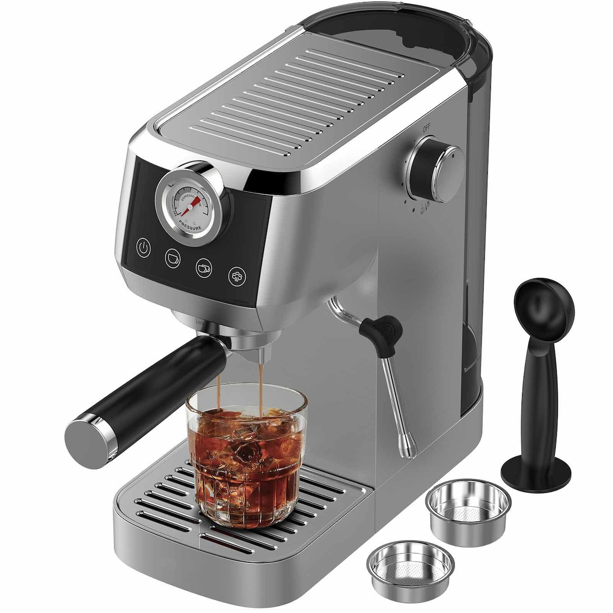 Espressomaschine halbautomatisch mit Manometer, 20 Bar Ulka-Pumpe, 51 mm Edelstahlfilter, 10 mm Milchschaumdüse, Tassenwärmer, Touch-Bedienung