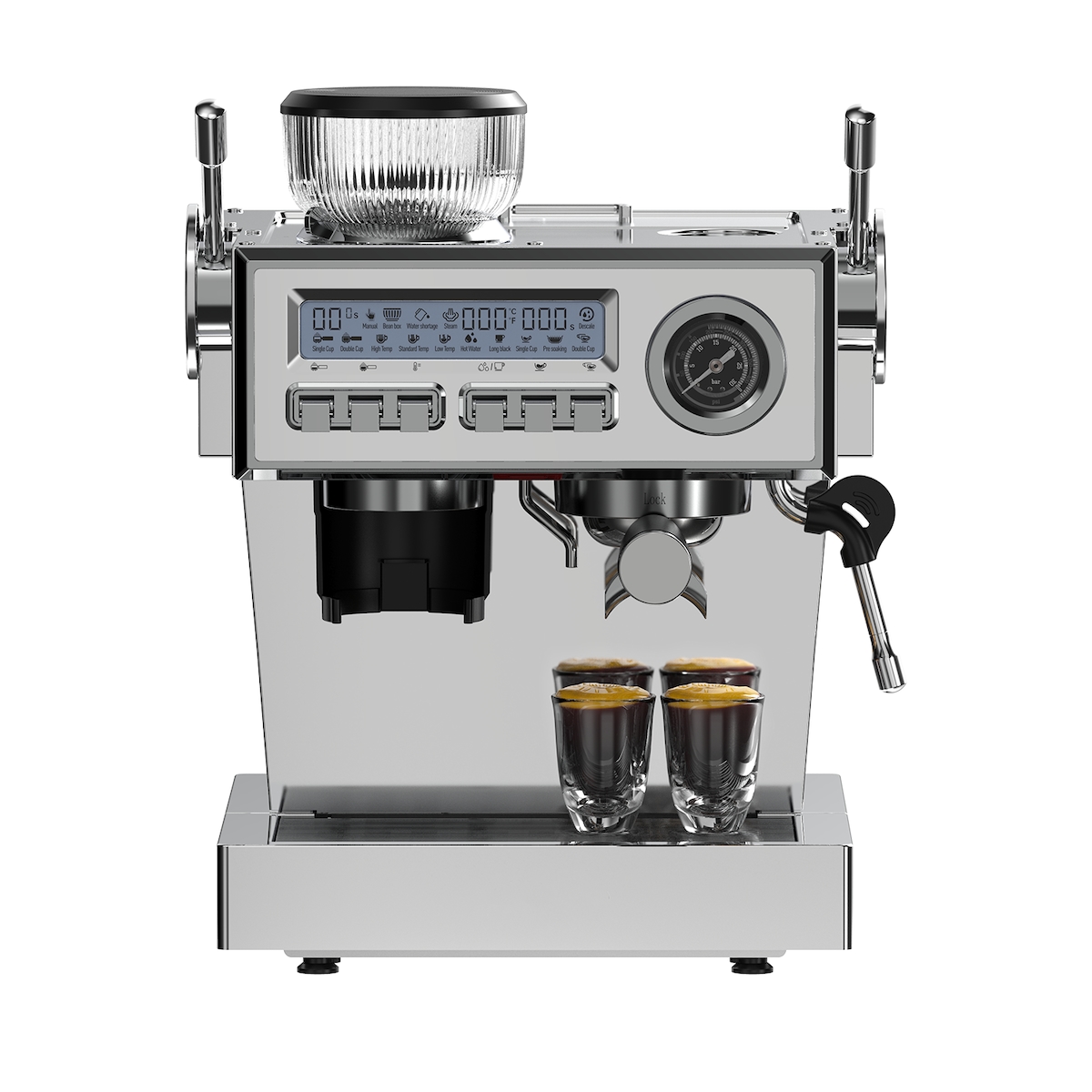 Espressomaschine mit Mahlwerk und Manometer, halbautomatisch, 20 Bar, Edelstahlgehäuse, 51 mm Filter, Milchschaumdüse, Tassenwärmer, Touch-Bedienung