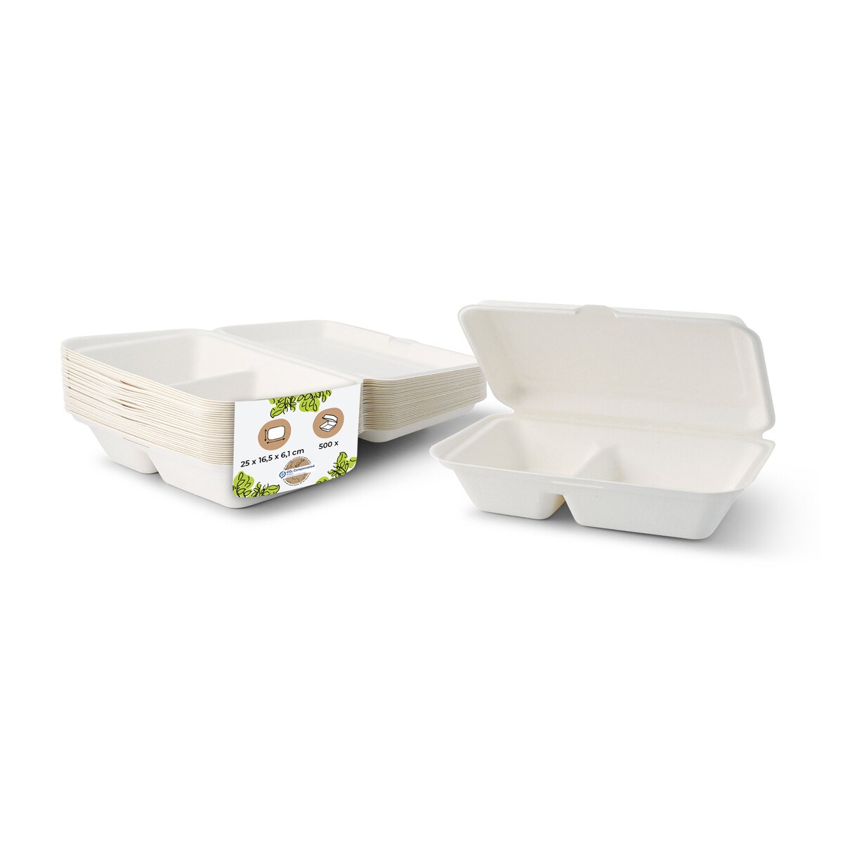 BIOZOYG 500 Stück Menübox 25 x 16,5 x 6,1 cm 2-geteilte, weiße Menüboxen aus Zuckerrohr, Bagasse, mit Klappdeckel Menüschachteln, Speiseschachteln