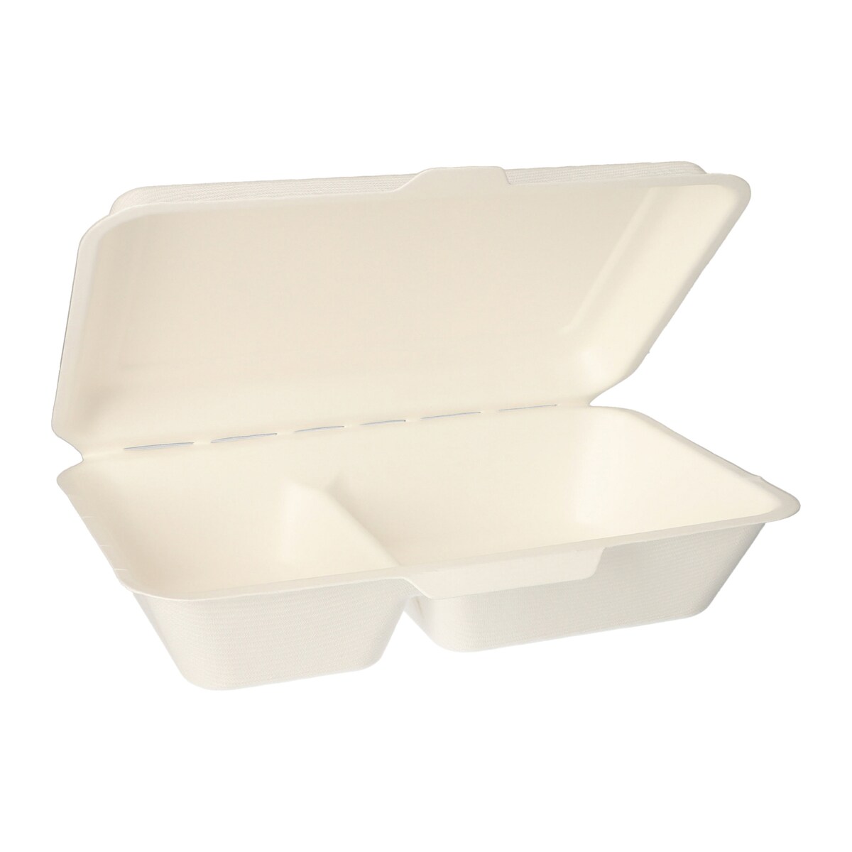 250 Menüboxen 2-geteilt 23 x 15 cm aus Zuckerrohr in weiß | umweltfreundlich