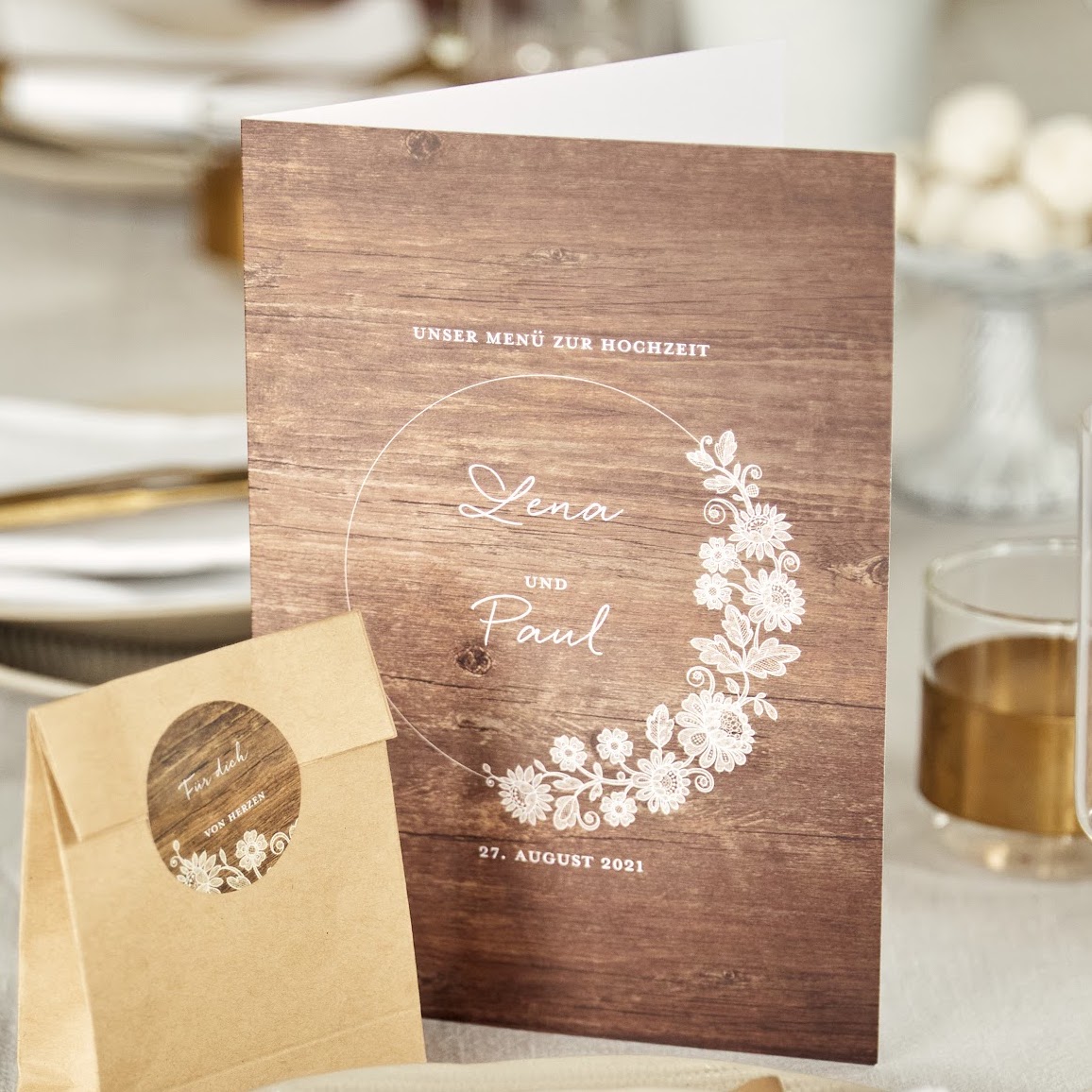 Menükarten, Getränkekarte Hochzeit, 5 Stück, Grosse Klappkarte hoch, Design: Liebe in warmbraun selbst gestalten. kartenmacherei