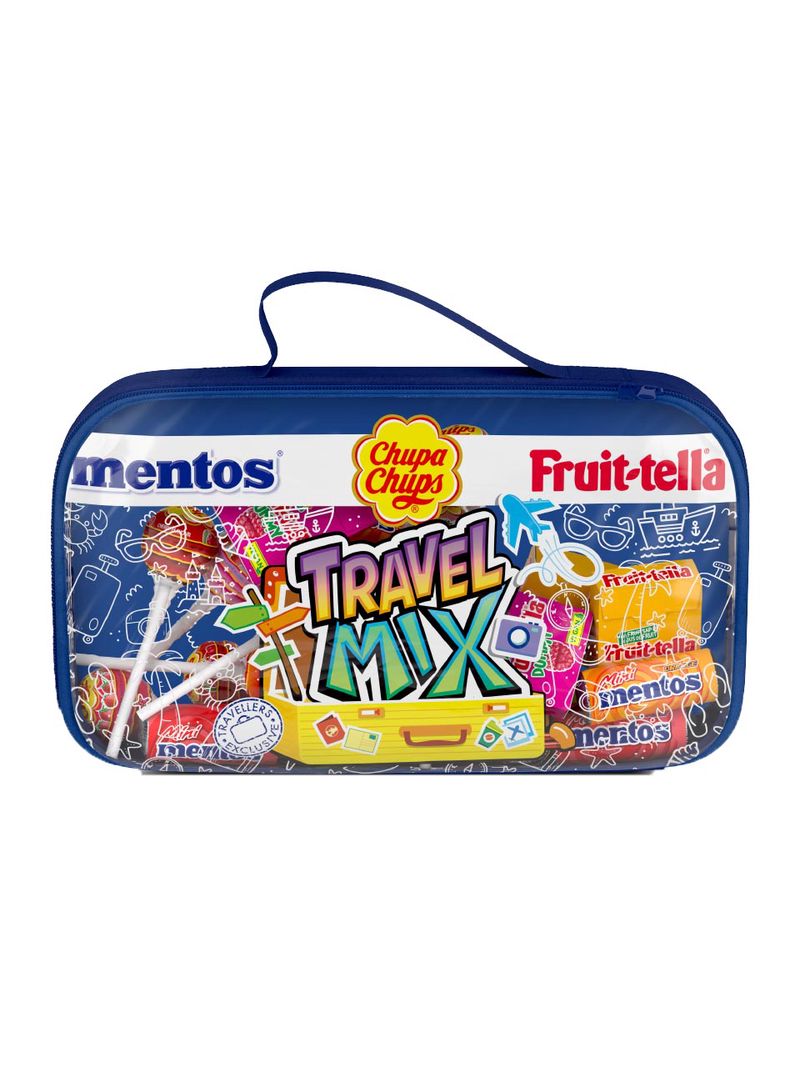 Eine Mischung aus Süßigkeiten von Chupa Chups, Mentos und Fruit-tella in einer transparenten, wiederverwendbaren Tasche