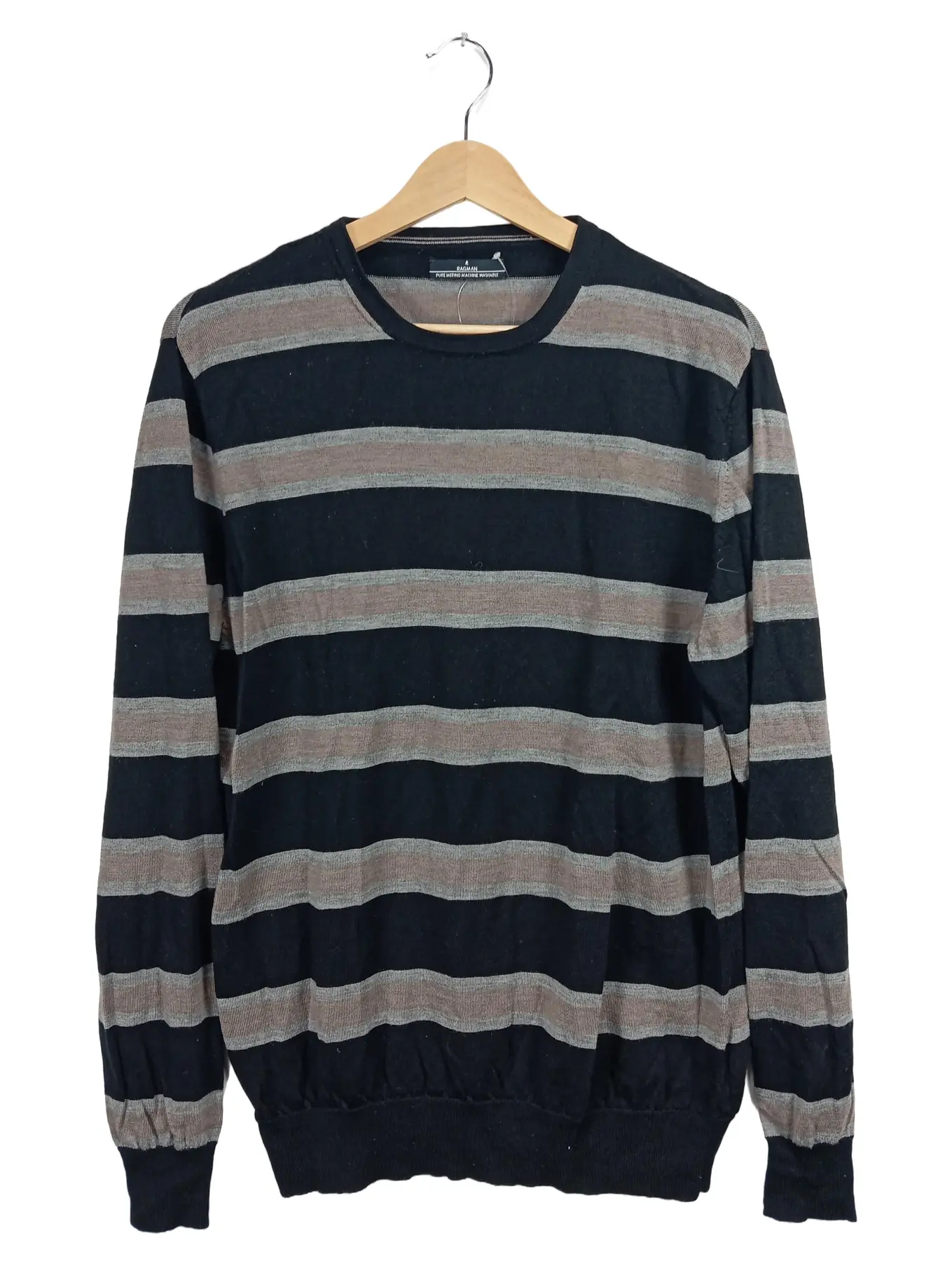RAGMAN Herren Pullover Merino Wolle Gestreift Schwarz L