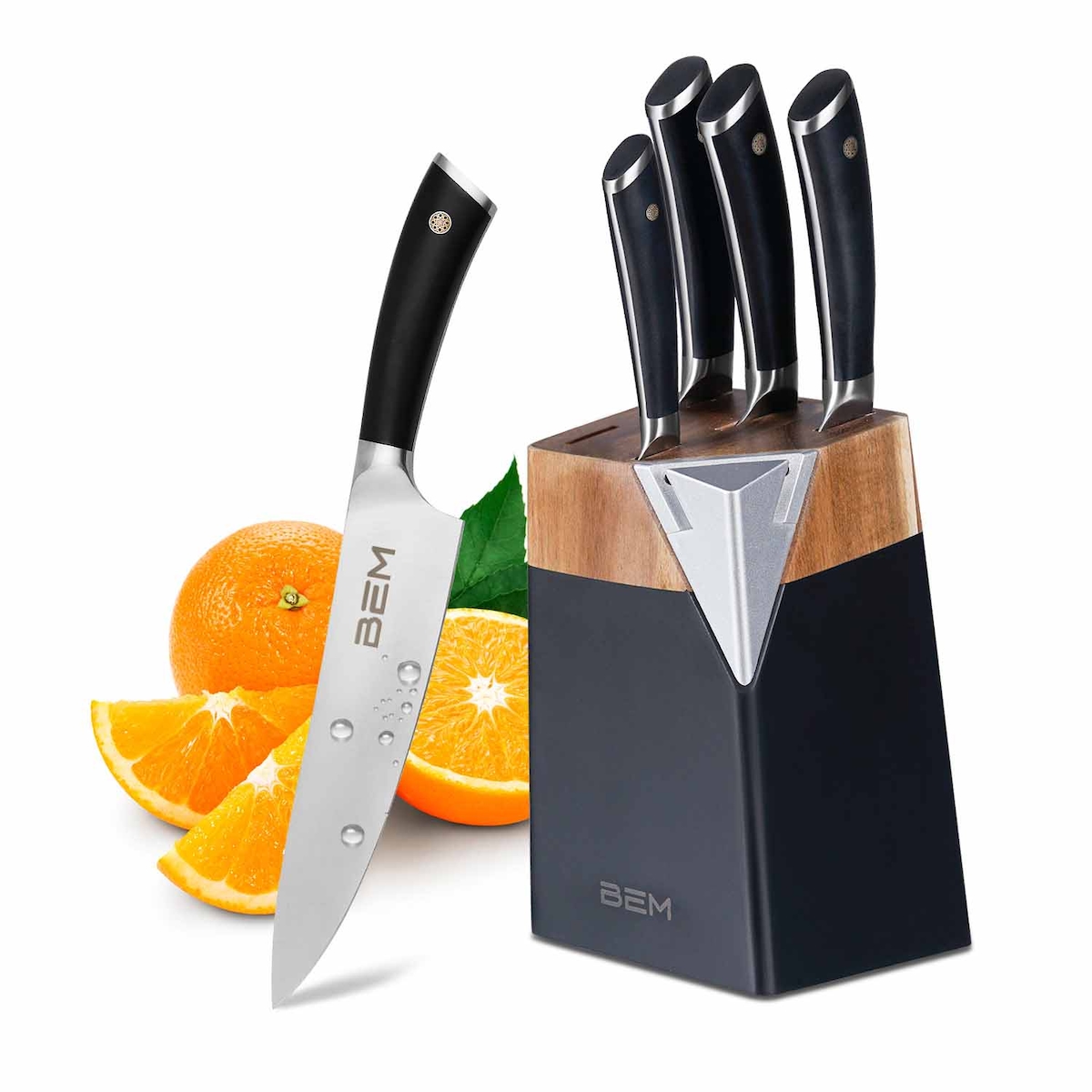 BEM Master Chef 6-tlg. Messerset Küchenmesser Set mit Messerblock inkl. Kochmesser, Gemüsemesser, Brotmesser; Messerblock mit Messer und Schärfer