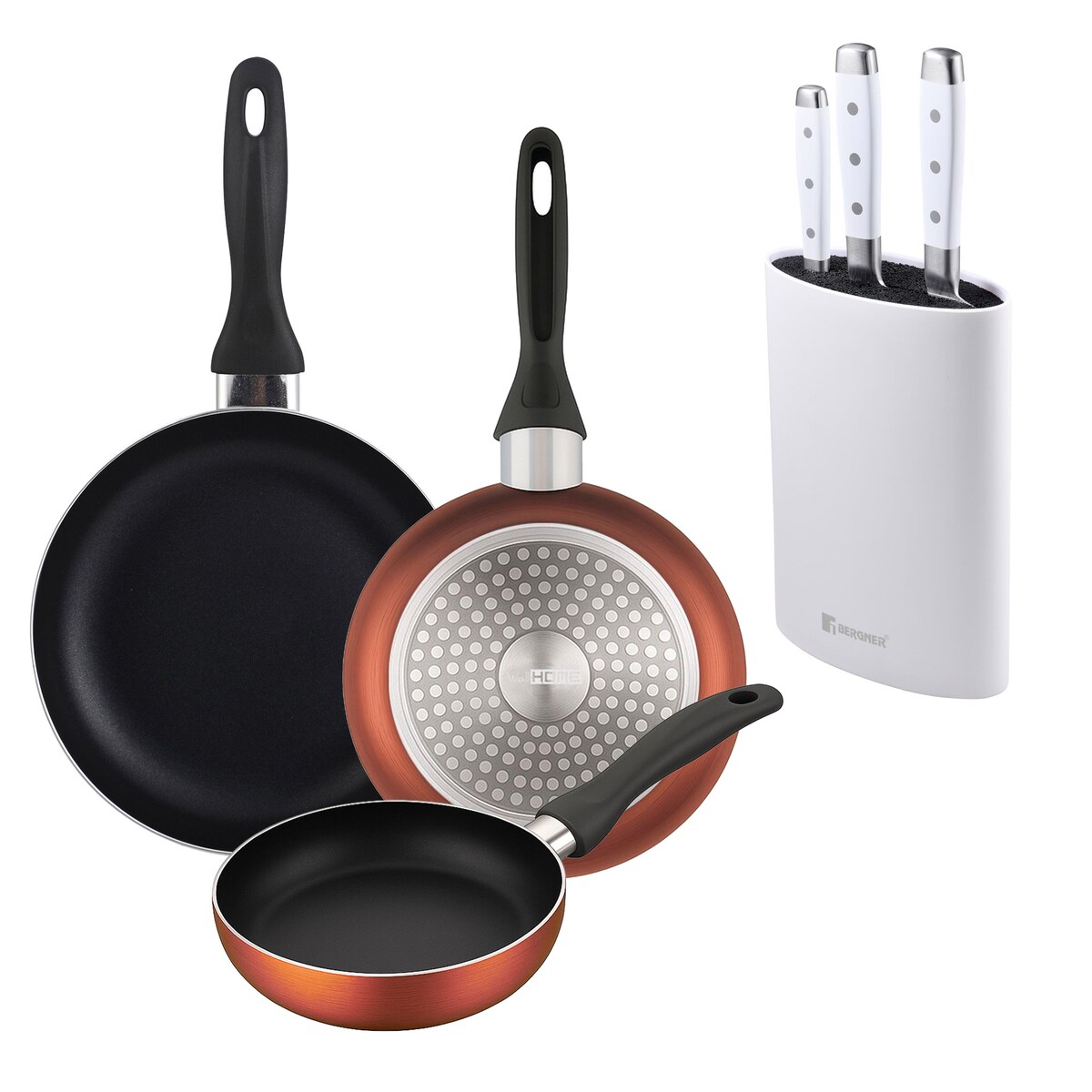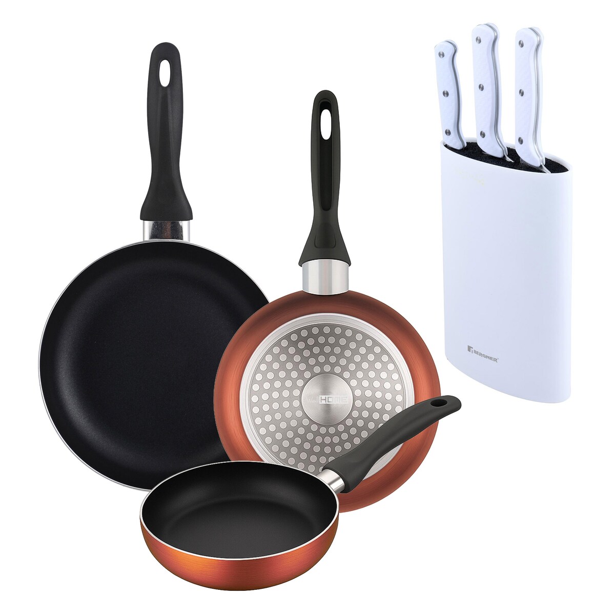 BERGNER - Set aus 3 Pfannen Ø16/20/24cm aus gepresstem Aluminium in metallic-copper mit 3-teiliges Messer-Set mit Messerblock aus Edelstahl