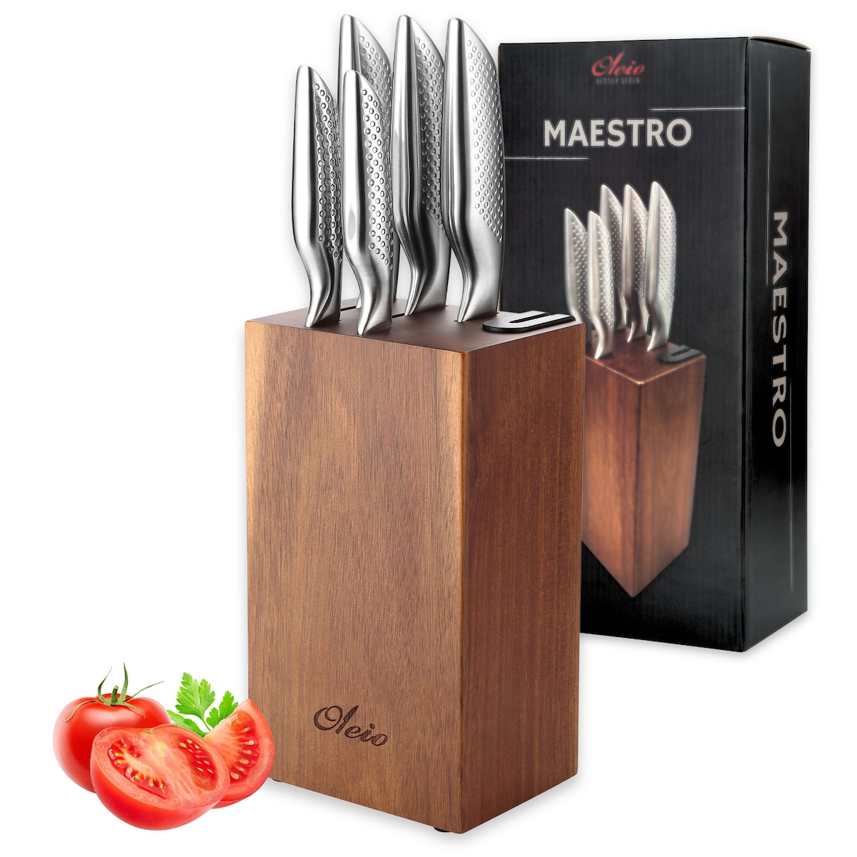 Oleio Maestro Messerblock Set, 5-teiliges Profi-Messerset mit integriertem Messerschärfer I Edelstahl Küchenmesser im eleganten Akazienholzblock