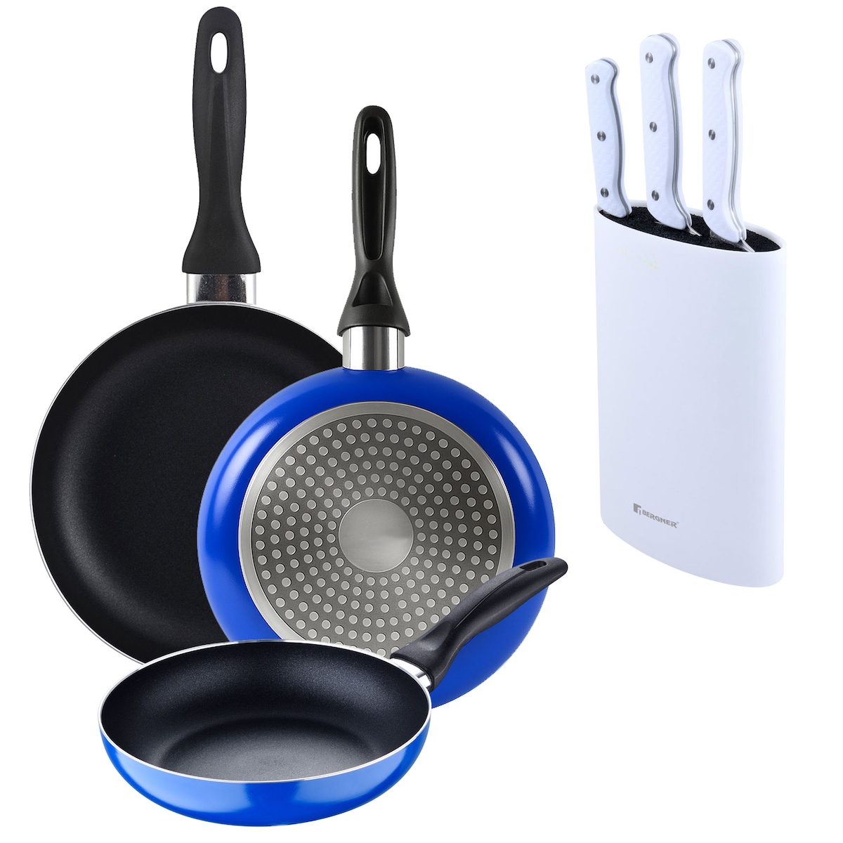 Bergner - Set aus 3 Pfannen Ø16/20/24 cm aus gepresstem Aluminium für Induktion Blue Navy mit 3-teiligem Messer-Set und Messerblock aus Edelstahl