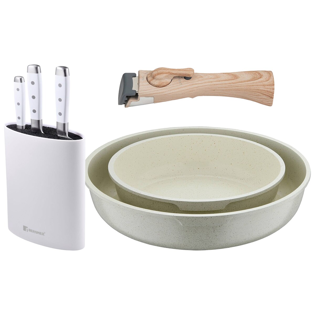 BERGNER - Set mit 2 Bratpfannen Ø22/26cm aus Aluminiumguss, weiß, mit abnehmbarem Griff mit 3-teiliges Edelstahlmesser-Set mit Messerblock