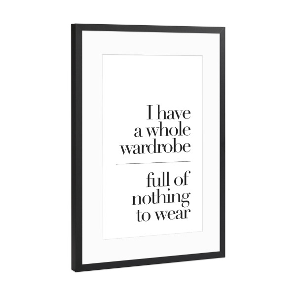 Poster mit Rahmen Schwarz (Metallic) "A WARDROBE FULL OF NOTHING" artboxONE - Typografie,Schwarzweiß,Fashion,Lustig