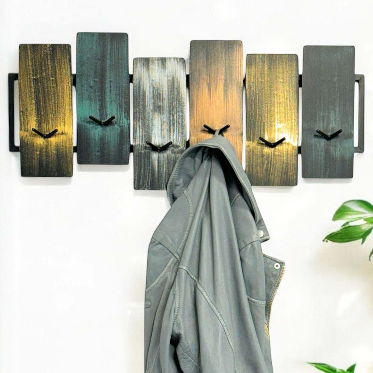 Wandgarderobe aus Altholz – 4 Doppelhaken aus schwarzem Metall – nachhaltige Garderobe in bunten Farben – für Flur und Eingangsbereich