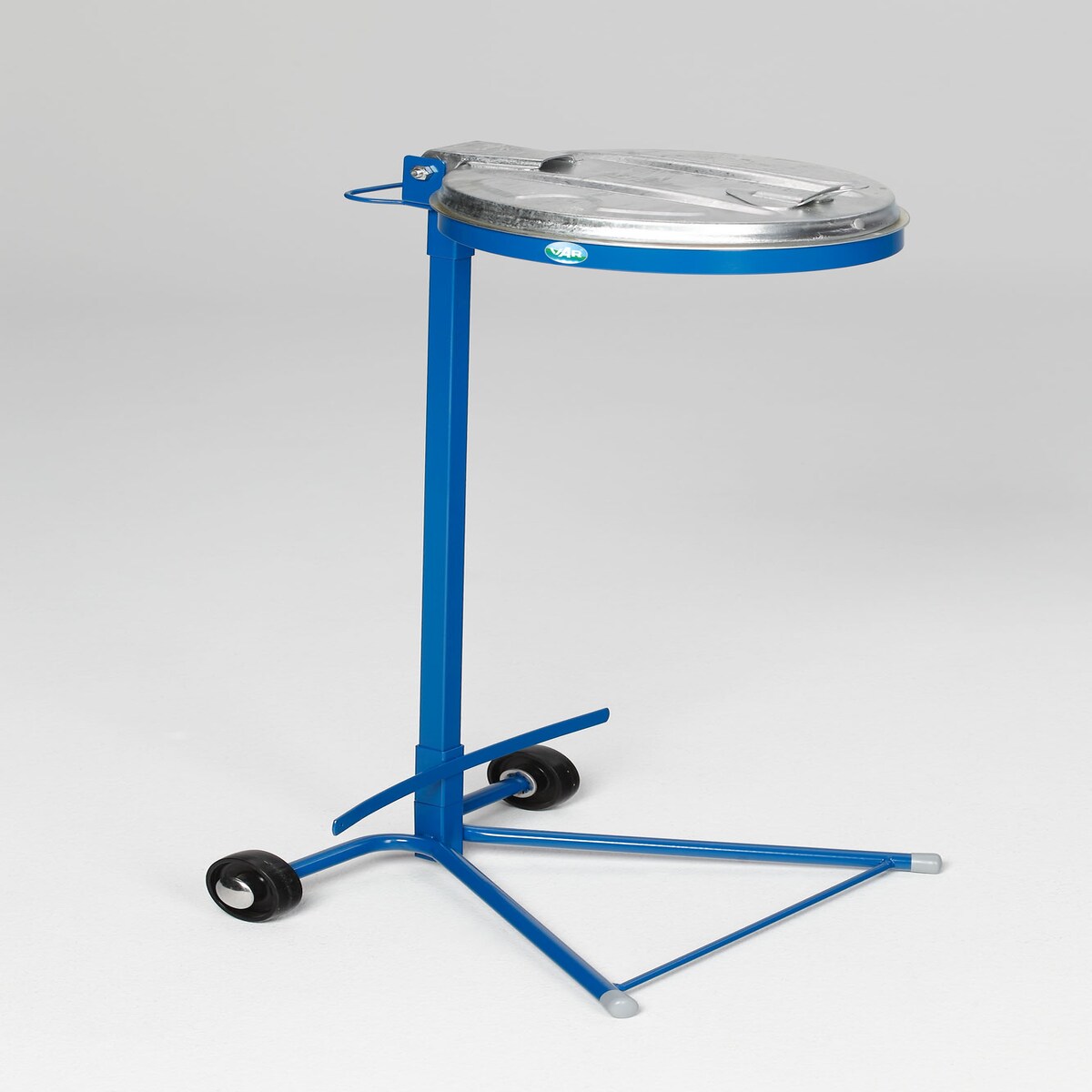 PROREGAL Robuster Abfallsammler mit Metall-Deckel | mit Standfuß + 2 Rollen | HxBxT 98x45x37,5cm | Stahl | Blau-Verzinkt | Mülleimer