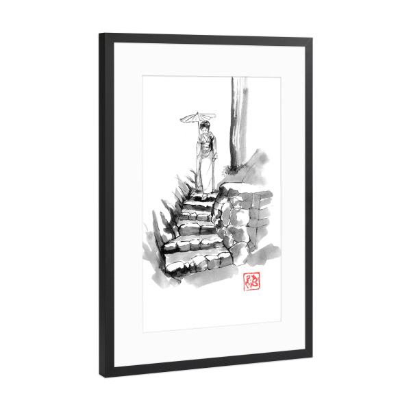 Poster mit Rahmen Schwarz (Metallic) "Frau steigt die Treppe hinunter" artboxONE - Reise / Asien - Treppen,Sumie,Japan,Geisha,Steine,Regenschirm