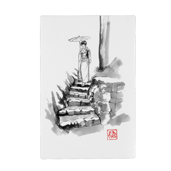 Metall Poster "Frau steigt die Treppe hinunter" artboxONE - Reise / Asien - Treppen,Sumie,Japan,Geisha,Steine,Regenschirm - Blechschild