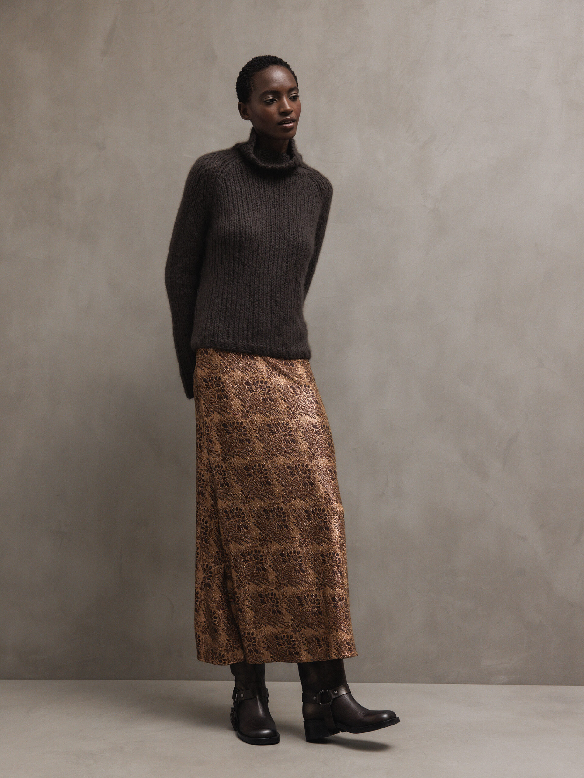 Braun- und beigen gemusterter Woll-Midi-Rock