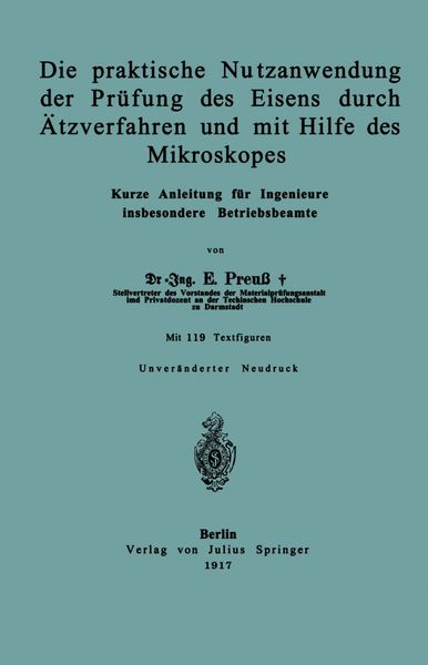 Die praktische Nutzanwendung der Prüfung des Eisens durch Ätzverfahren und mit Hilfe des Mikroskopes, Taschenbuch von E. Preuss, Springer Berlin,
