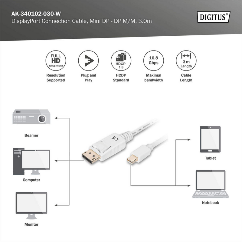 InLine Mini DisplayPort zu HDMI/DVI/DisplayPort Adapterkabel, weiß