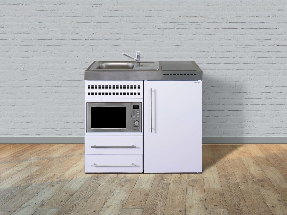 Stengel MPM 100 Miniküche, 100cm breit, Induktionskochfeld, Kühlschrank mit Gefrierfach, mit Mikrowelle, Spüle links, weiß (10100 010681 00)