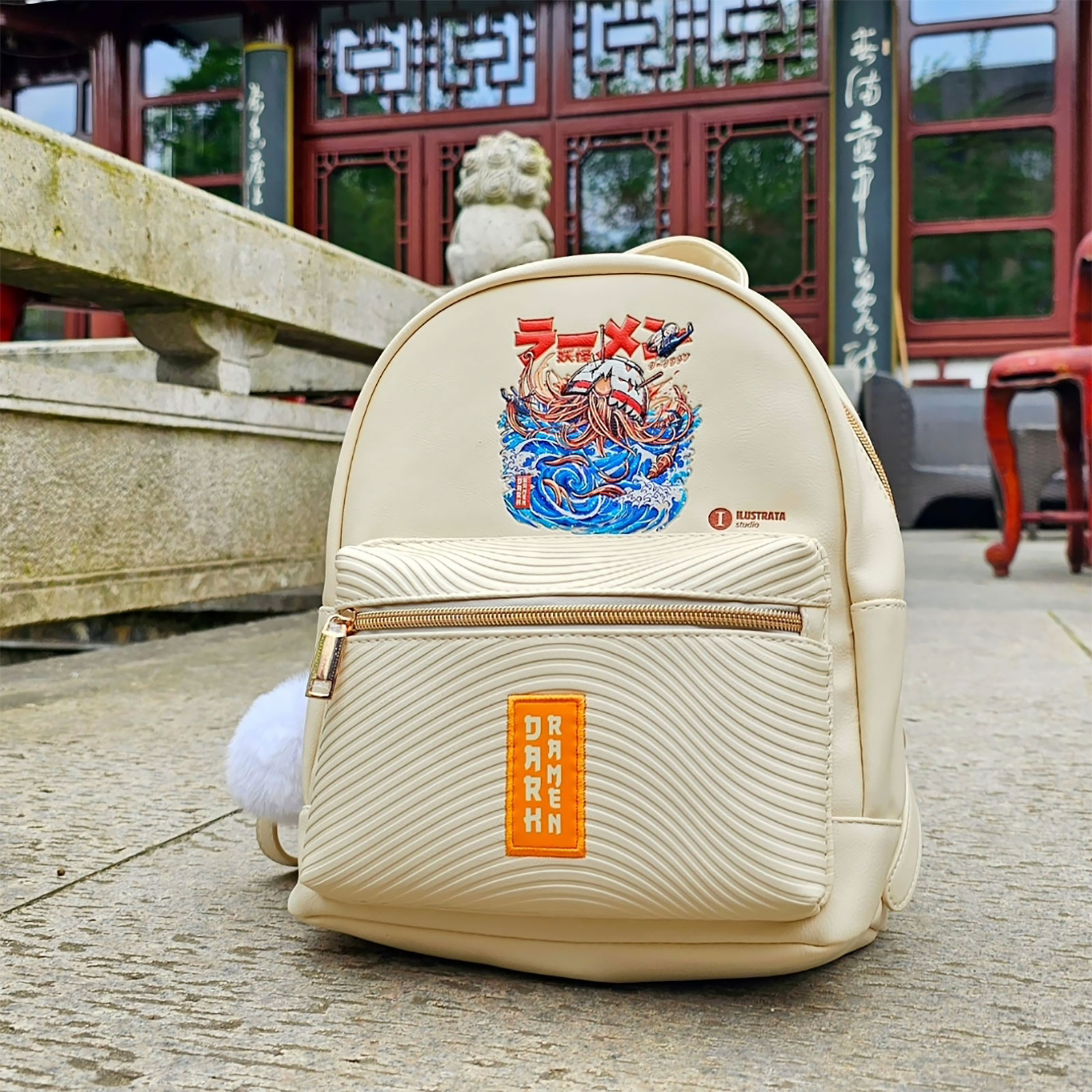 Ilustrata - Mochila Dark Ramen con colgante Pom Pom beige