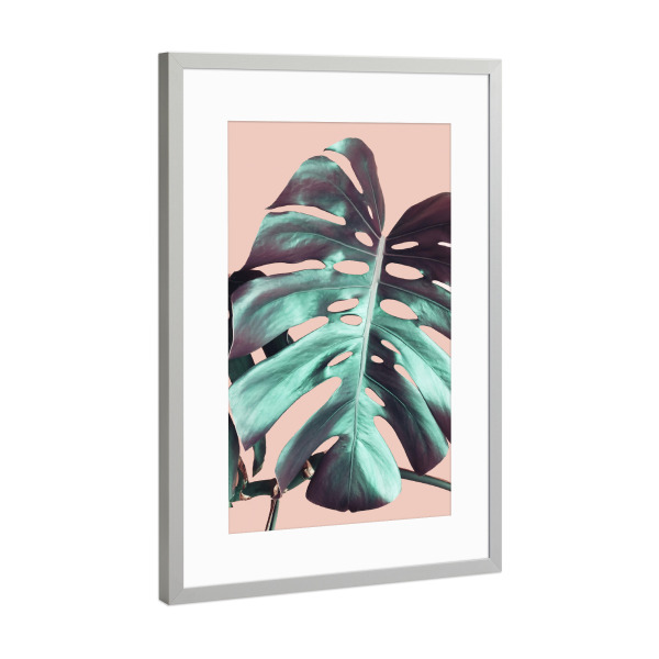 Poster mit Rahmen Silber "Monstera Leaf on Pink" artboxONE - Natur,Floral - Pink,Monstera,Leaf,Nature,Plant,Pflanze,Leaves,Blätter,Natur,Green,Grün