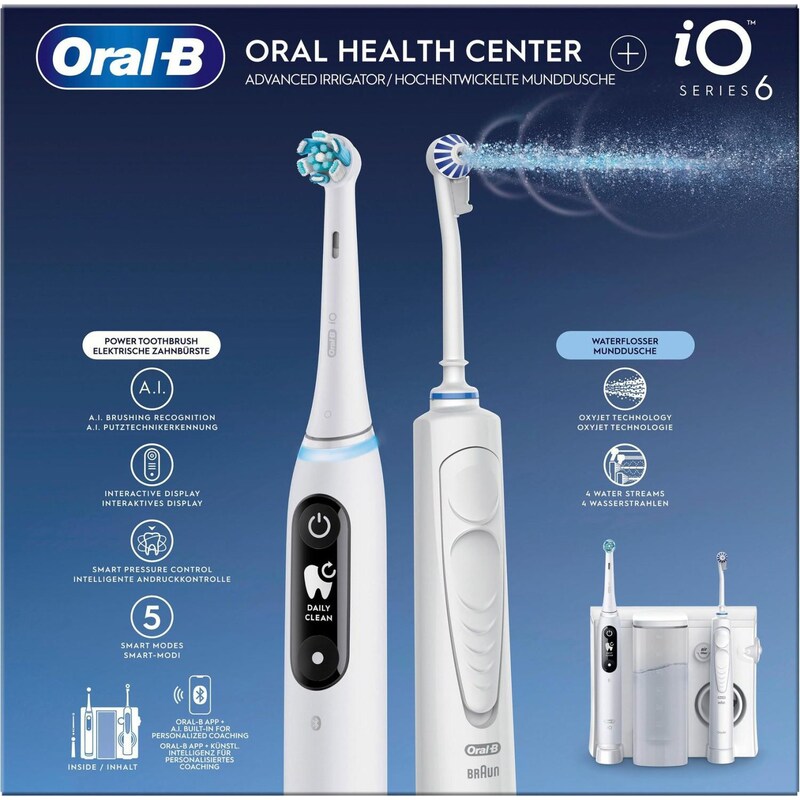 Oral-B Center OxyJet Reinigungssystem - Munddusche + Oral-B iO6 Mundpflege, weiß