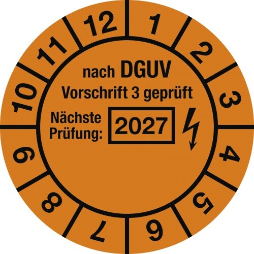 Prüfplakette, Geprüft nach DGUV Vorschrift 3, Nächste Prüfung, 2027, Standardfolie, Ø15mm, Bogen