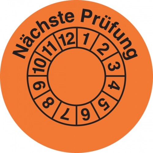 König Werbeanlagen Prüfplakette, Nächste Prüfung, orange/schwarz, Folie, Ø 35 mm - Bogen = 10 Plaketten - 35 mm Folie selbstklebend