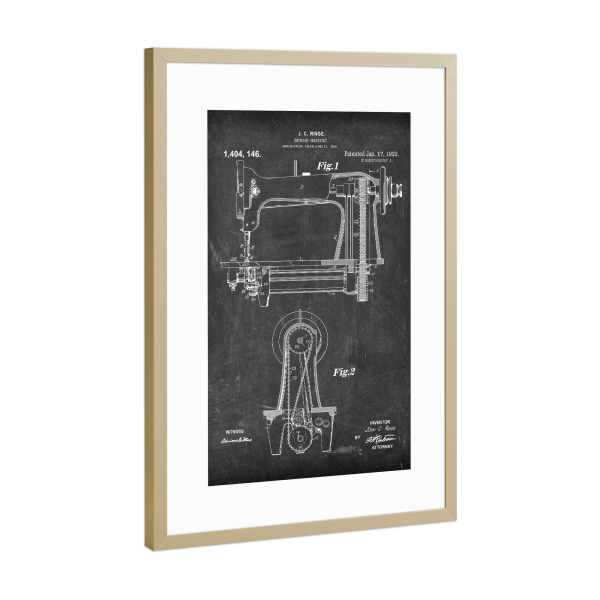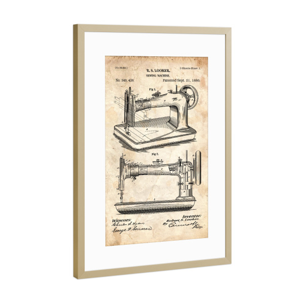Poster mit Rahmen Gold "Nähmaschine (Antik)" artboxONE - Fashion - Blaupause,Entwurf,Retro,Vintage,Antike,Patent,Nähen,Schneidern,Fashion