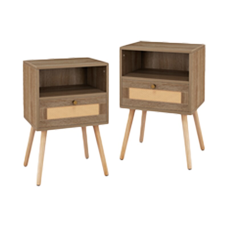 Rattan-Nachttisch im 2er-Set, Boho-Nachtschränke mit Massivholzbeinen, Schublade und offenem Regal, moderne Beistelltische mit Stauraum